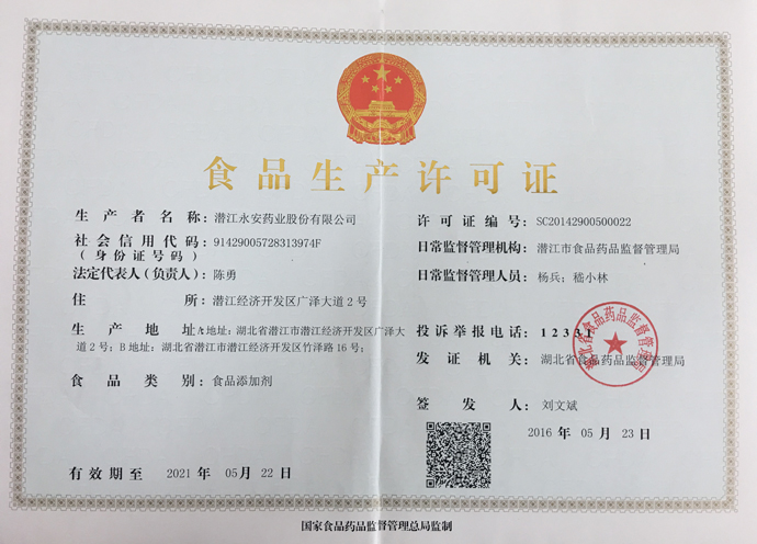 潛江永安藥業股份有限公司成立于2001年,坐落于江漢平原腹地潛江市國家高新技術產業開發區,占地500余畝,注冊資金貳億玖仟肆佰陸拾捌萬貳仟伍佰元整,是一家擁有自主知識產權的國家高新技術企業。公司股票于2010年3 月5日在深圳證券交易所掛牌上市(股票代碼為002365)。公司具有雄厚的技術開發能力,是湖北省創新型企業和湖北省知識產權建設示范企業。公司研發平臺分別被認定為省級企業技術中心和湖北省功能性食品添加劑工程技術研究中心。 經過多年的發展,公司形成了以食品及藥品添加劑牛磺